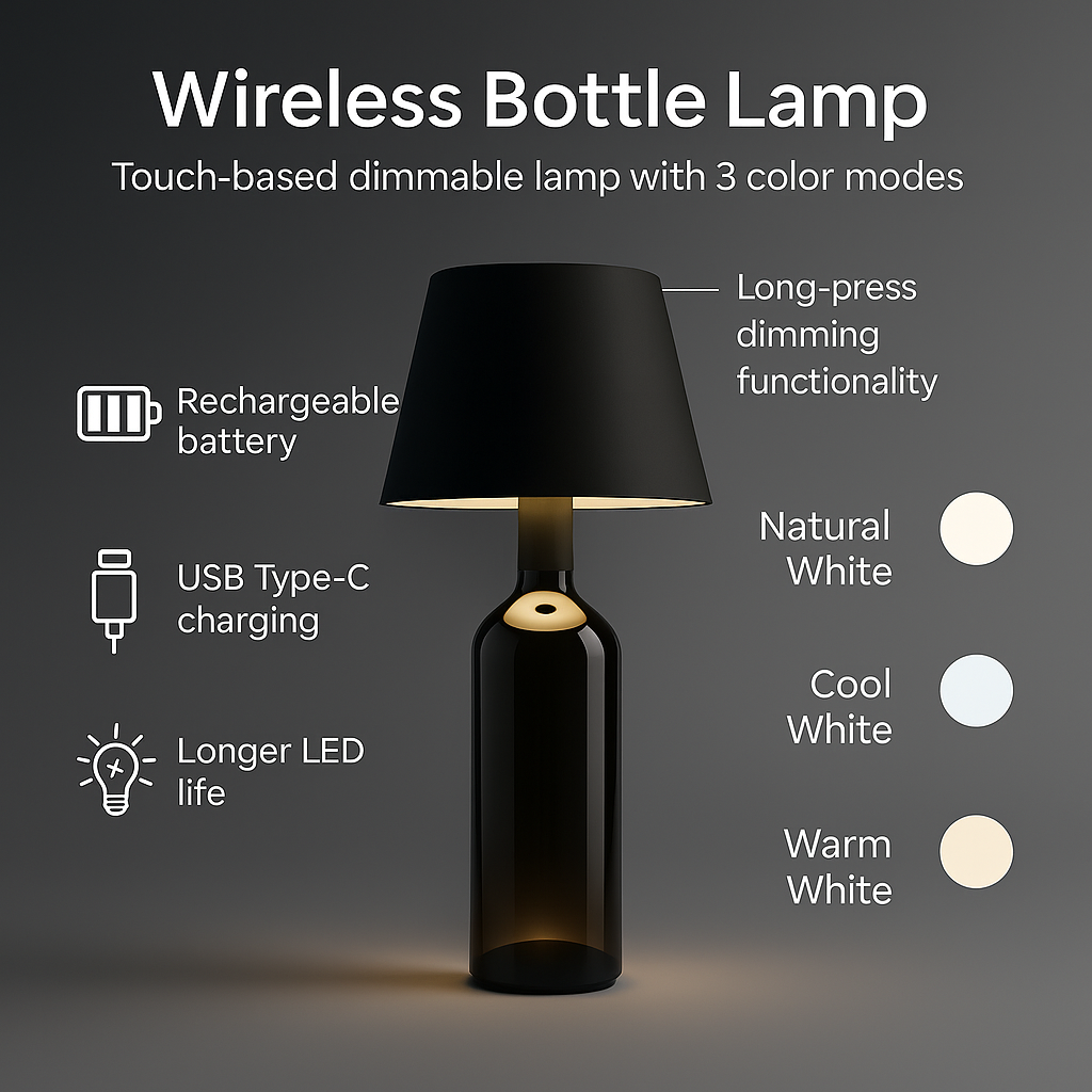 Discover the perfect blend of style and function with our Wireless Bottle Lamp! This portable dimming bar night lamp features a rechargeable 1800mAh battery, ensuring you always have the perfect ambiance at your fingertips. Designed with a wine bottle decor aesthetic, it’s perfect for both indoor and outdoor gatherings.